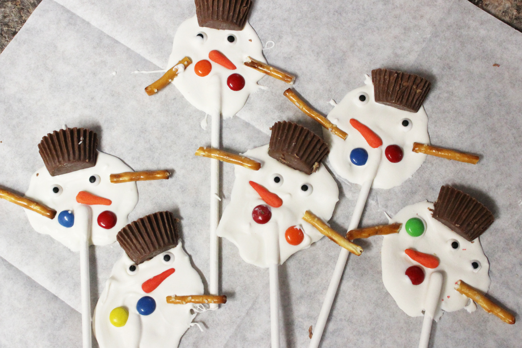 I melted the included white chocolate discs and then spread them out on the (included) wax paper to form melted snowmen, then added the Reese’s Cup, cut in half, as the hat. The eyes, carrot nose, M&Ms, and pretzel stick arms were all added in random spots to enhance the melting look.