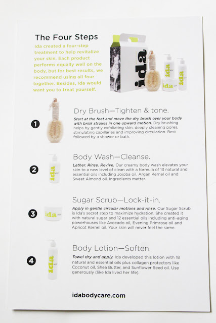 The Four Steps treatment is the basis of the Ida Body Care line. Ida created this treatment to help revitalize your skin. While all will work well on their own, combining them provides the best results.