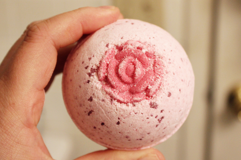 The Fizzing Bath Bomb has a pretty rose design. As the name says, it’s a fizzing bomb, so it dissolved pretty quickly. It has a blend of bath salts mixed in, so you’re left with soothing and pleasantly scented bath water once this is done dissolving.