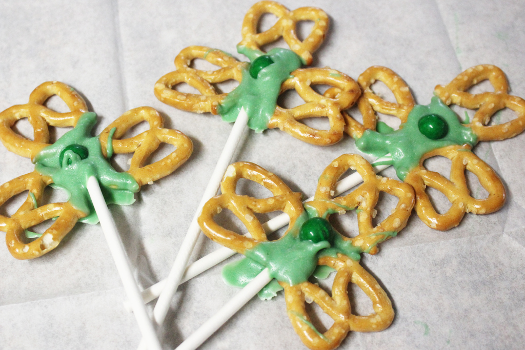 The first project was Shamrock Pretzel Pops. To assemble them, I melted the chocolate discs in the microwave and then dipped the “U” shaped end of each pretzel into the chocolate and connected three pretzels to form a shamrock shape. I added a little extra in the center to attach the stick and chocolate candy in the middle. These are so cute and such a creative idea!