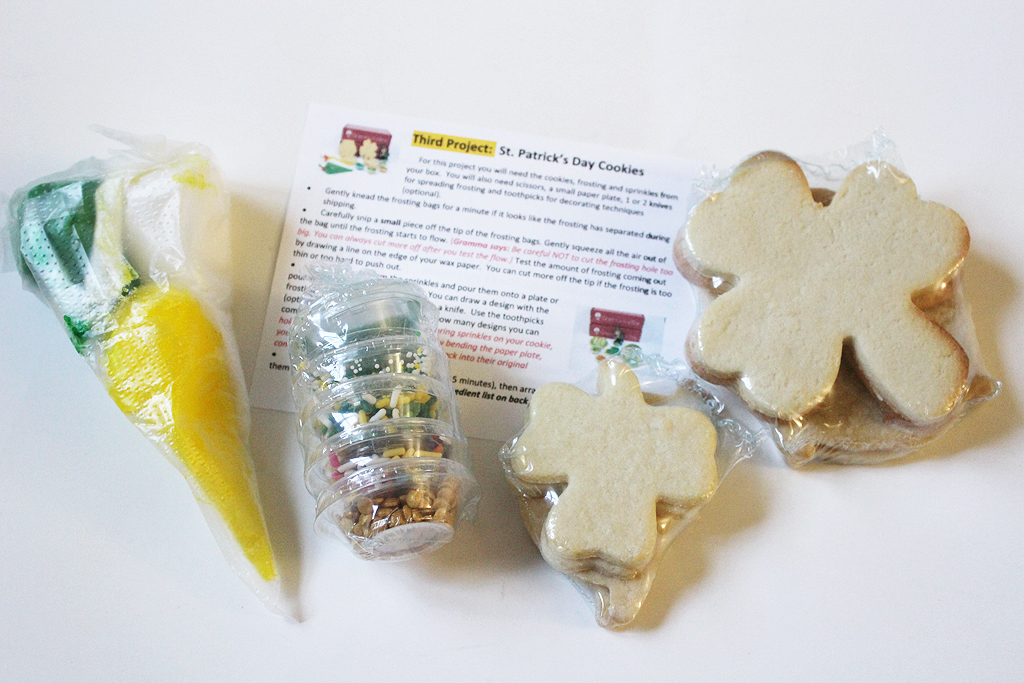 The third project is always cookies, and the March cookies were St. Patrick’s Day themed. As stated earlier in the post, starting in April boxes will contain even more cookies – a full dozen! The cookies are pre-baked and shrink wrapped in plastic to maintain freshness, but be sure to do your crafts within a week of receiving the box for optimal freshness.