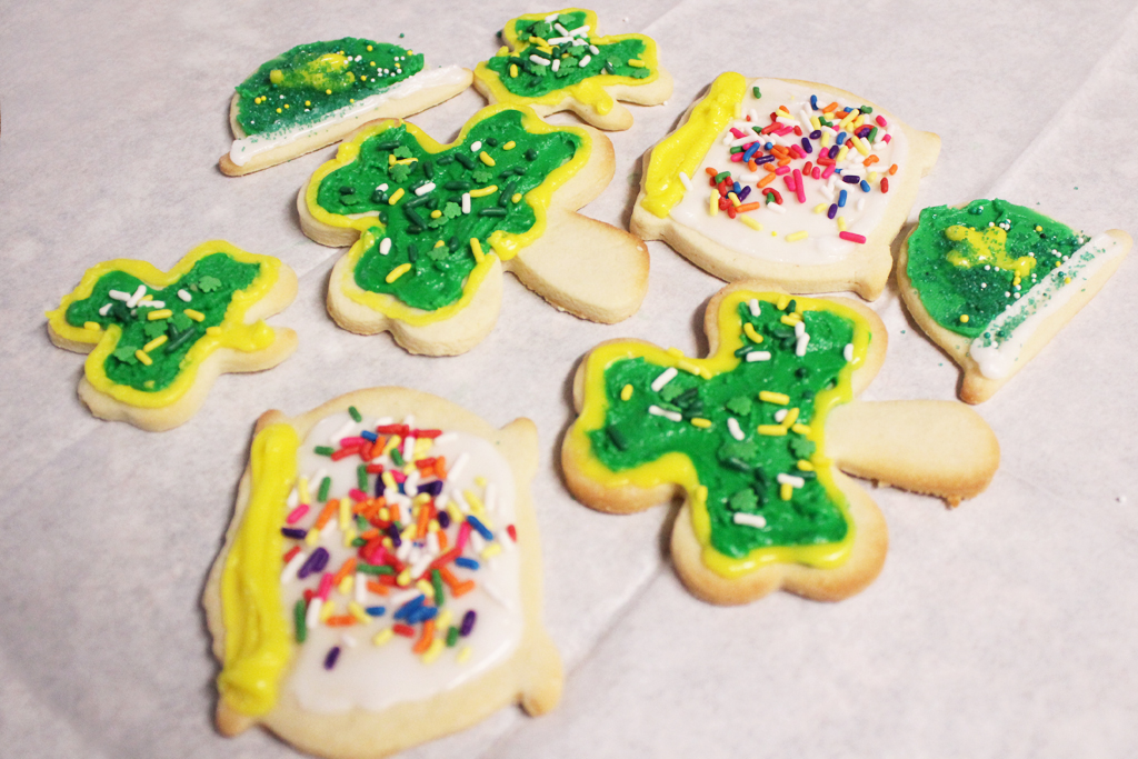 The cookies were shaped like pots of gold, shamrocks, and leprechaun hats with yellow, white, and green icing. There were several sprinkles of different shapes and colors, too.