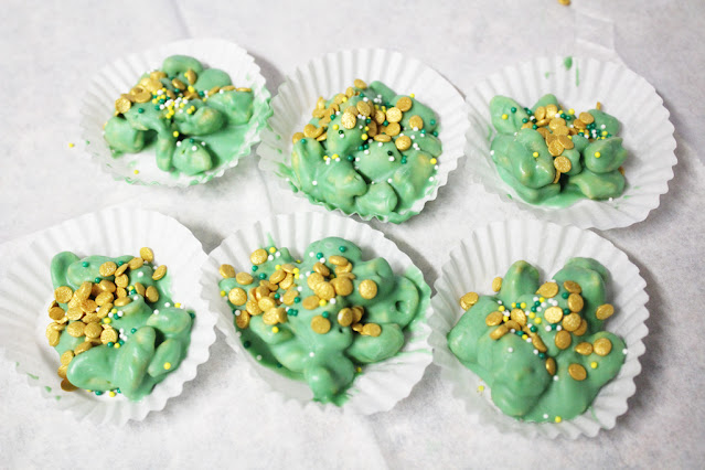 The second project, Crispy Pot ‘O Gold Cups, involved mixing the remaining melted chocolate with puffed cereal and scooping it into the paper cups. I then added gold and other colored sprinkles for decoration.