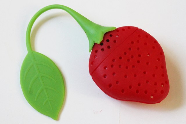 The reusable infuser is so cute! It’s a strawberry shape and the leaf hangs over the side of the cup.