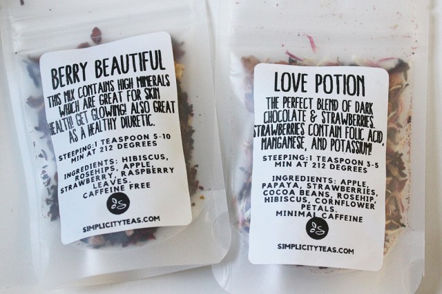 The two bags of tea were Berry Beautiful and Love Potion. The Berry Beautiful blend has hibiscus, rosehip, apple, strawberry, and raspberry leaves and is caffeine-free. It is a healthy diuretic and has a high mix of minerals for skin health. The Love Potion blend has apple, papaya, strawberries, cocoa beans, rosehip, hibiscus, and cornflower petals with minimal caffeine. It has folic acid, manganese, and potassium.