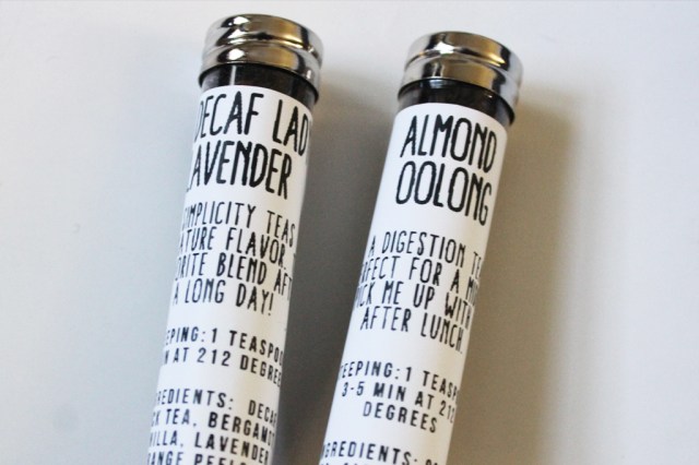 The two vials contained Decaf Lady Lavender and Almond Oolong. Decaf Lady Lavender contains decaf black tea, bergamot, vanilla, lavender, and orange peels is great for relaxing after a long day. Almond Oolong is exactly what it sounds like: oolong tea (pronounced “woo-long”) and almond flavor and it is caffeinated. This one is good for a midday pick up and aids in digestion.