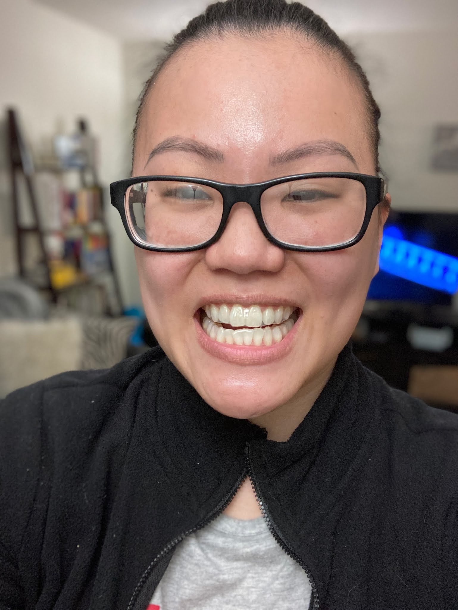 Here’s me and my big forehead with the strips on my upper and lower teeth! You can see that they fit snugly against the teeth.