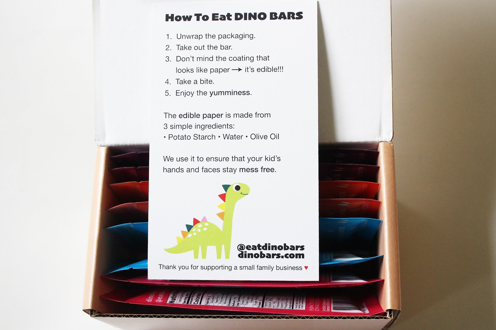 The edible paper wrapped around each DINO BAR is made with potato starch, water, and olive oil. It’s tasteless and is a unique way to keep your child’s (or yours!) hands clean while eating the bar. It’s such an ingenious addition to a great product!