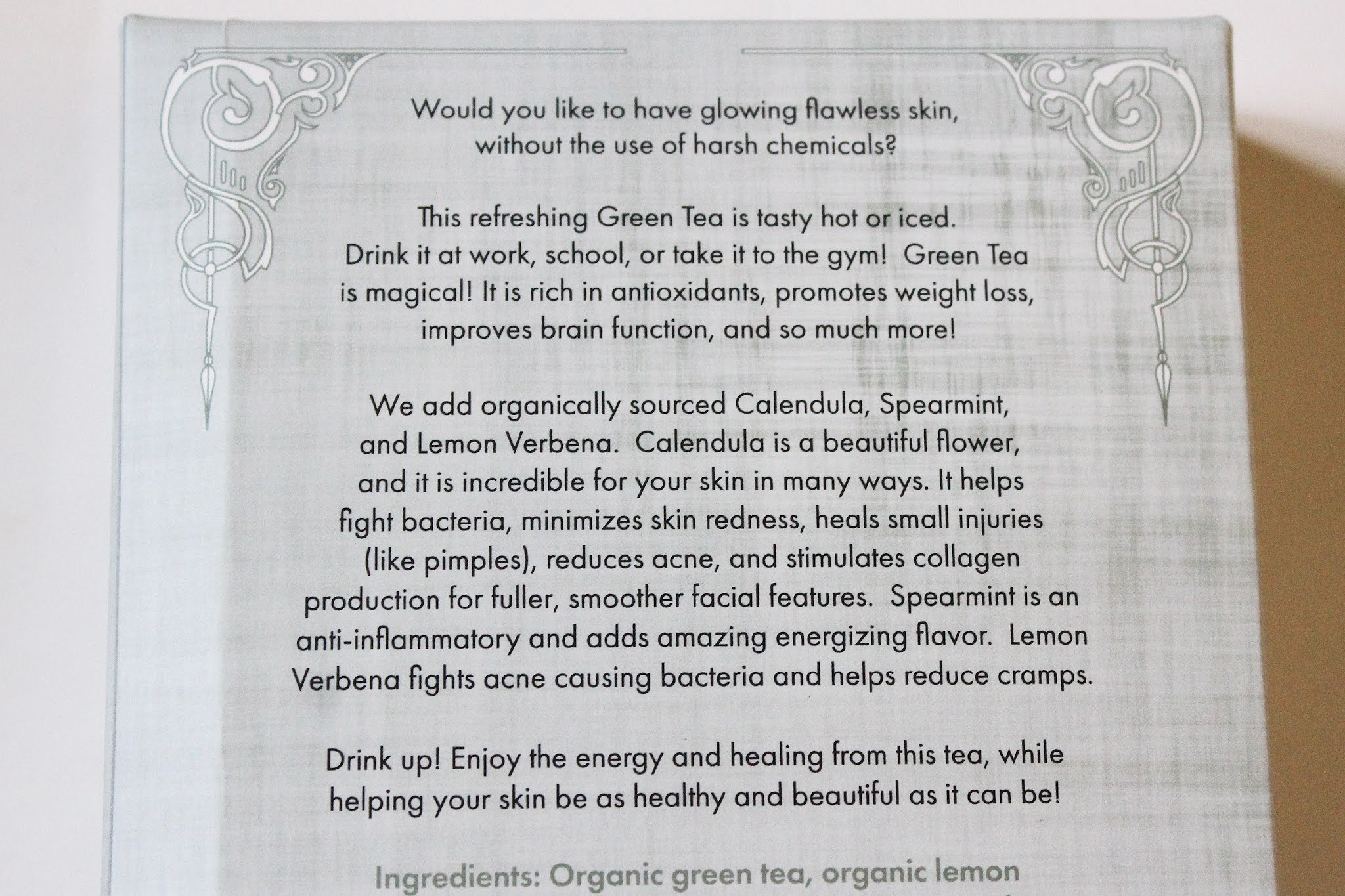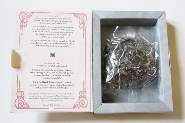 The Afternoon tea is a green tea blend with 50 milligrams of caffeine per cup. It’s great hot or iced and has calendula, spearmint, and lemon verbena. As with the morning tea, calendula has many skin benefits. Spearmint is an anti-inflammatory and lemon verbena fights acne-causing bacteria and helps reduce cramps.