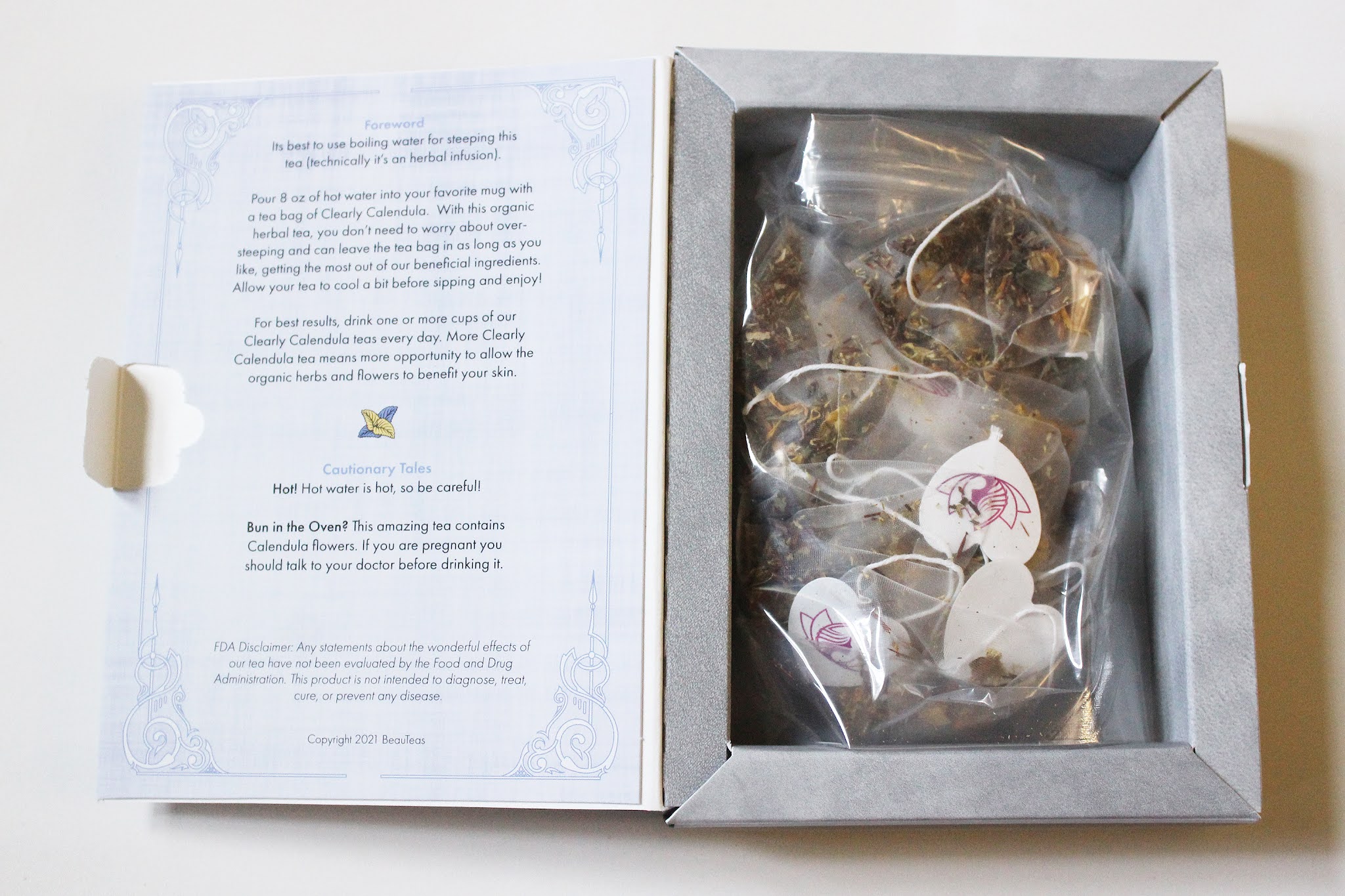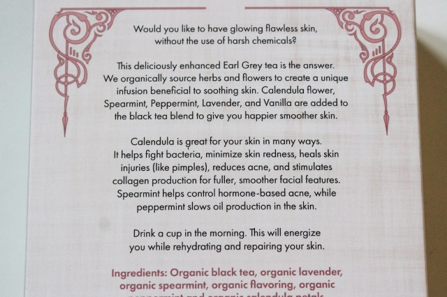 The Morning tea is made with calendula and has 50 milligrams of caffeine in each cup. It’s a delicious Earl Grey tea with organically-sourced herbs and flowers, including spearmint, peppermint, lavender, and vanilla for smoother skin. The Calendula helps fight bacteria, minimize redness, heal skin injuries like pimples, and stimulate collagen production. pearmint helps control hormonal acne and peppermint slows oil production.