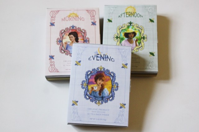 The teas are available in Morning, Afternoon, and Evening flavors. Each box has 10 individually wrapped tea bags inside.