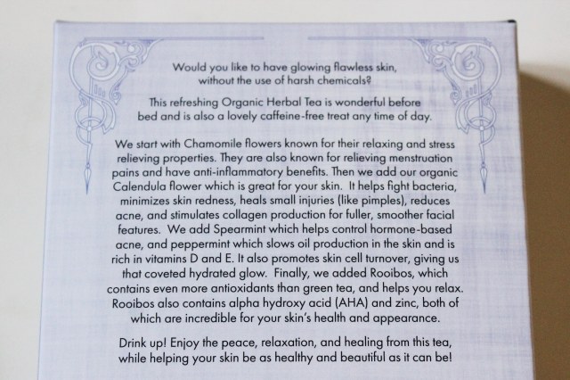 The Evening tea has no caffeine, of course, since drinking caffeine at night wouldn’t be great for your beauty sleep! This tea has chamomile flowers, which are known to have relaxing and relieving properties. It also helps relieve pain from menstrual cramps and has anti-inflammatory benefits. Calendula is in this tea, too, as well as spearmint and peppermint. Finally, Rooibos has more antioxidants than green tea and helps you relax. It also has alpha hydroxy acids (AHAs) and zinc, which are great for the skin’s appearance.