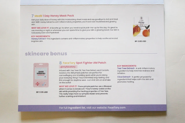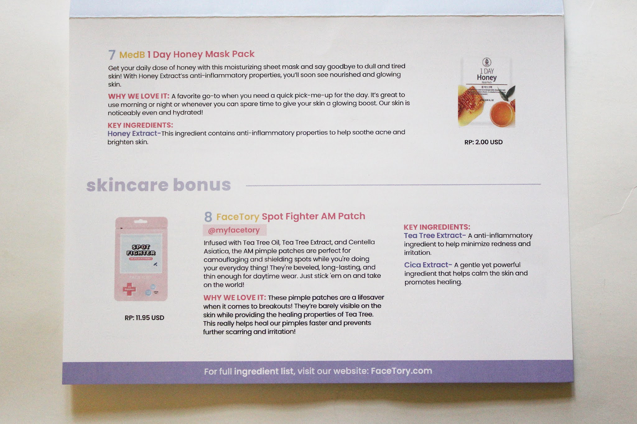 The extra item for this month was the FaceTory Spot Fighter AM Patch. I love patches like these for when I break out and other ones I’ve tried have worked pretty well. They have tea tree oil, tea tree extract, and centella asiatica to fight acne and prevent further scarring and irritation.
