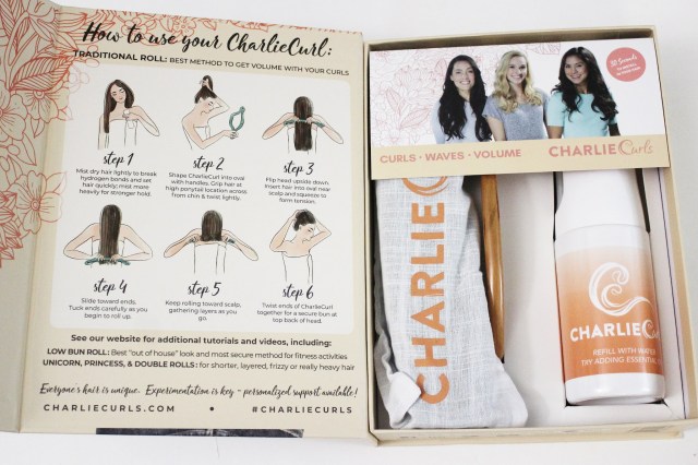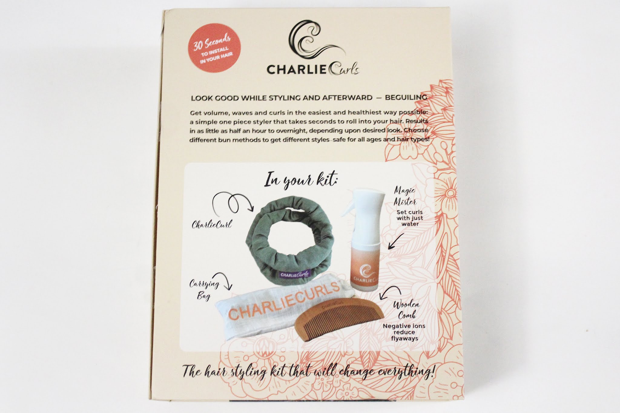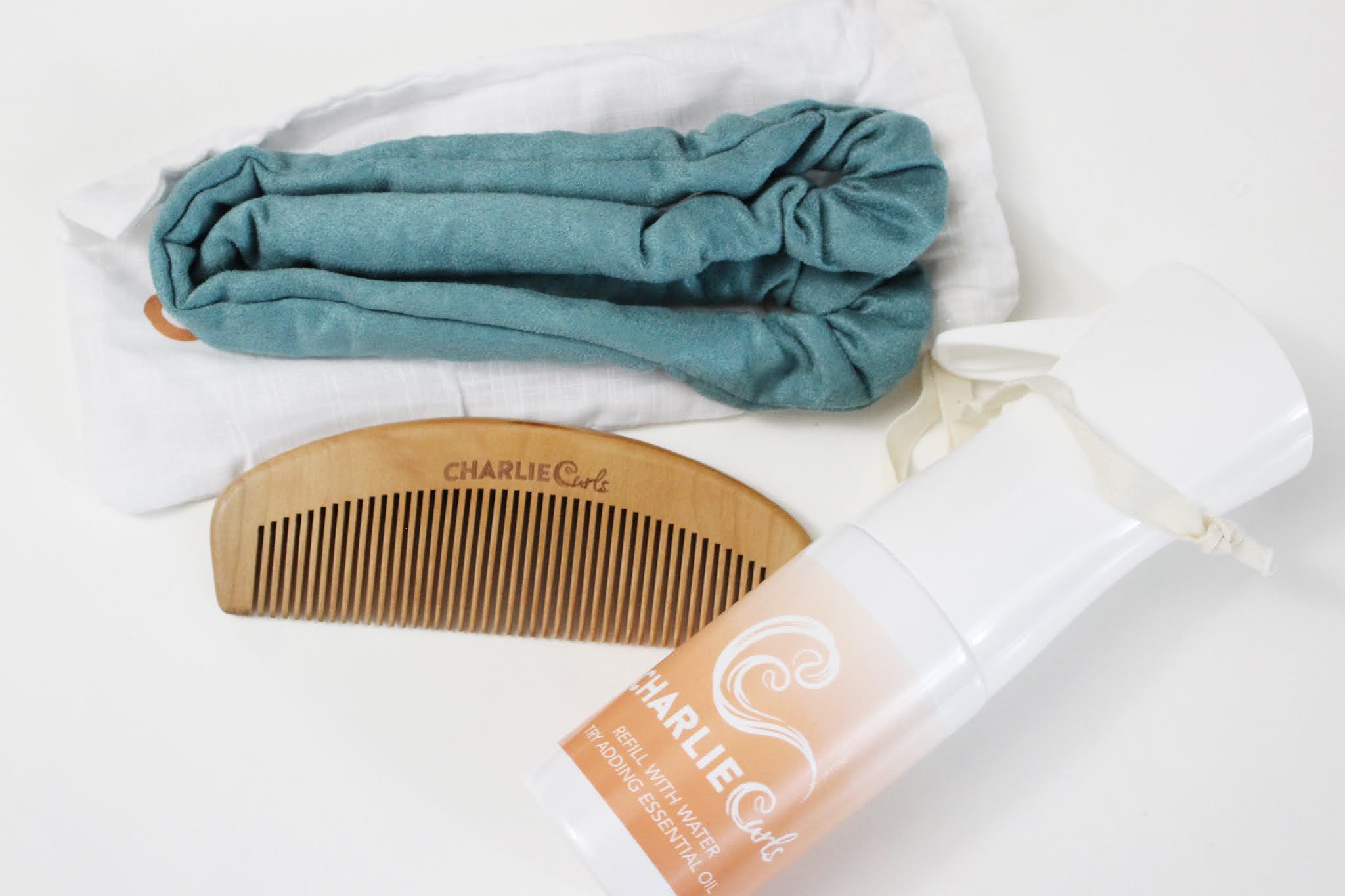 The kit contains instructions on how to use the CharlieCurl: first you mist your hair with water using the misting bottle, comb through with the wooden comb, and then twist your hair into an updo with the CharlieCurl.