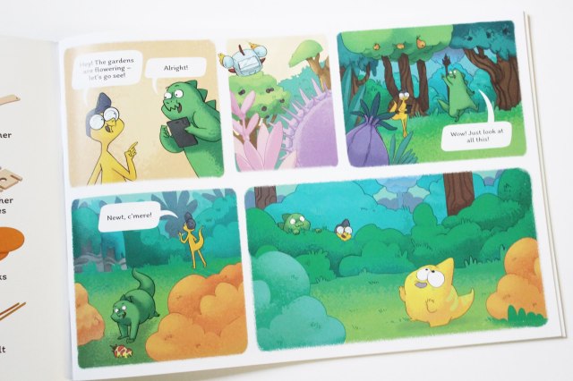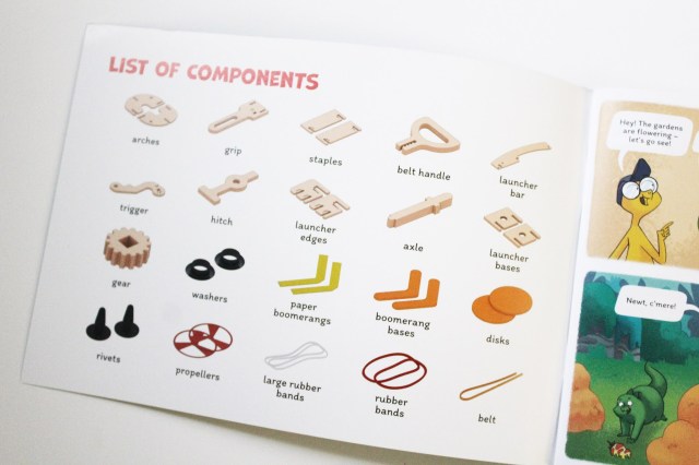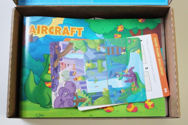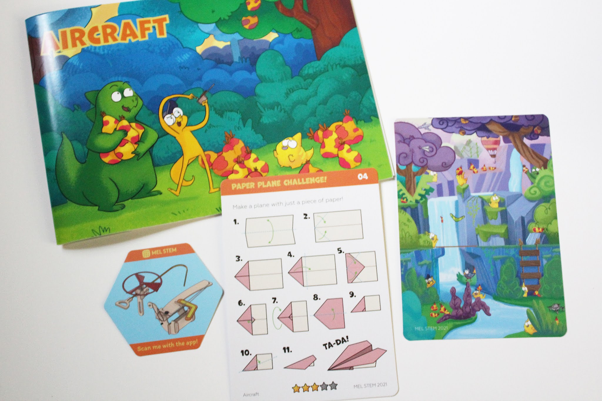 The kit comes with a full color booklet with a comic strip telling a story behind the kit, as well as instructions and more fun activities. This box featured a story about helping little creatures get fruit from atop of a tree, hence why the aircraft were needed. There were also two card inserts with other activities.