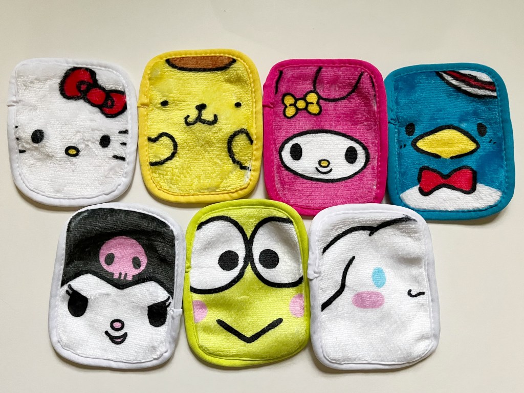 These cloths are adorable! From left to right and top to bottom we have: Hello Kitty, Pompompurin, My Melody, Tuxedo Sam, Kuromi, Keroppi, and Cinnamoroll.