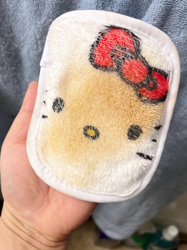 Here’s what the Hello Kitty cloth looked like after I removed a full face of makeup. It truly does remove so much makeup with just a few passes over the skin, including my waterproof mascara! They feel soft on the skin, too.