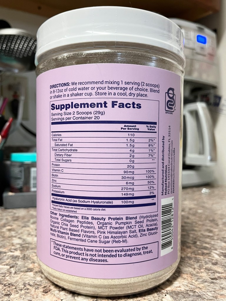 There are no artificial flavors, sweeteners, flavors, or colors in Ella. It’s available in Chocolate and Vanilla flavor and I received the Vanilla powder to review. It contains collagen and organic seed protein with a blend of beauty-boosting hyaluronic acid, zinc, vitamin C, biotin, and more to improve skin elasticity, smoothness, and give a natural glow.