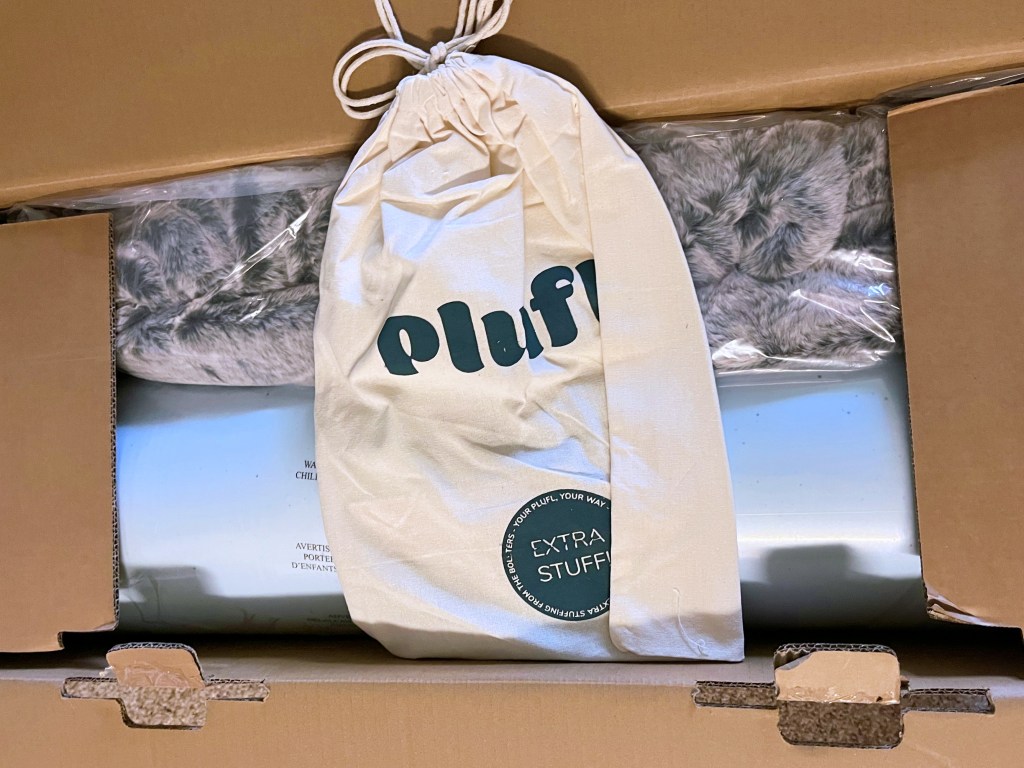 The covering is so soft and reminds me of some of the faux fur blankets I have from West Elm. As you can see in the second photo, there are handles on either end to help you transport/store the Plufl. It supposedly folds in half for storage, but I haven’t tried to store mine. There is also a pocket on the side you can put your phone, etc in.
