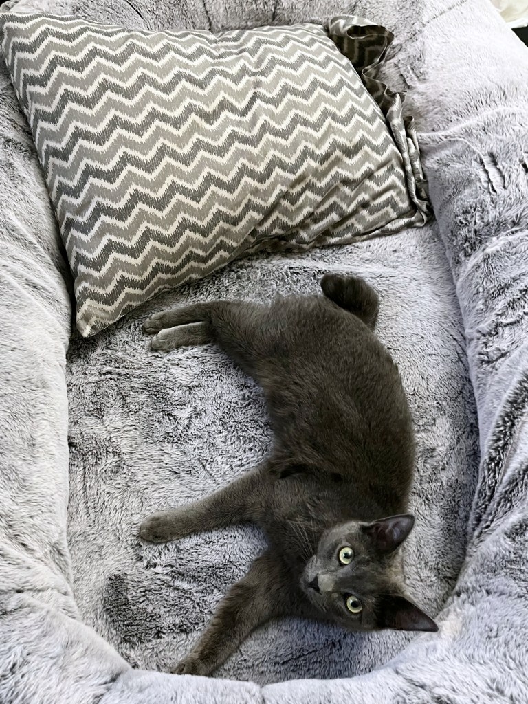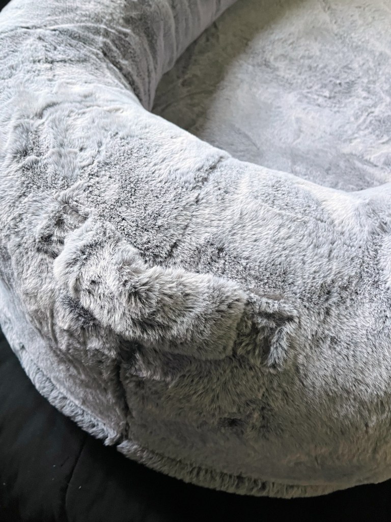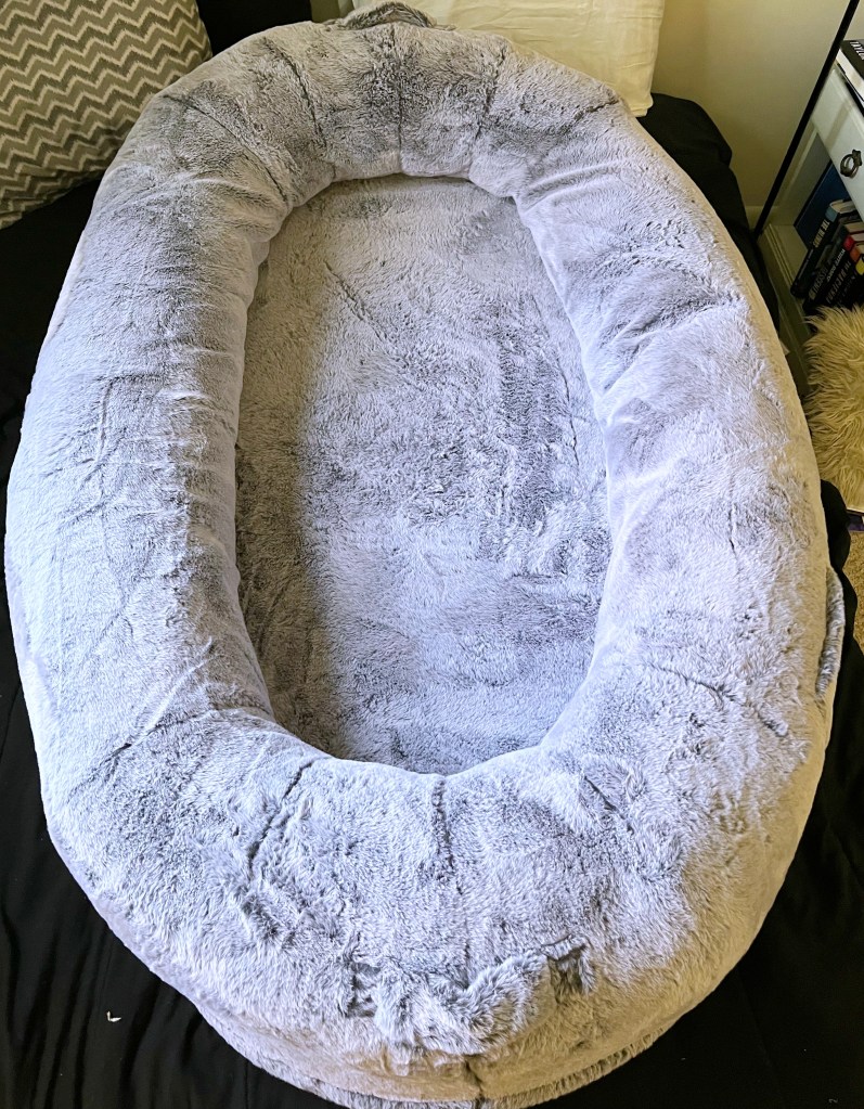 And here it is! It is exactly what it says it is — a human-sized dog bed. “Human-sized” is generous, as I’m 5’3 and I can fit inside this comfortably, but if I lie down supine my legs and feet hang over the end. I don’t think this would be very comfortable for anyone taller than 5’5 or so.