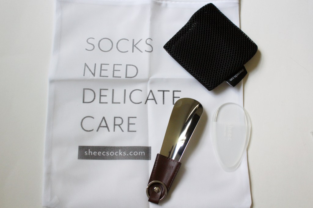 Sheec Socks also sells accessories, including laundry bags, shoehorns, and foot files. The laundry bags are something I wouldn’t have thought about, but obviously it makes sense to care for your socks by washing them in a delicates bag. The shoehorn is, of course, for helping you get your shoes on and off, and the foot file is my favorite of the bunch. It’s made of glass and available in “Fine” and “Super Fine” varieties. At the time I received this my heels were pretty dry and callused and were catching on my bedsheets and socks, which is the grossest feeling! This file quickly and painlessly took care of that problem.