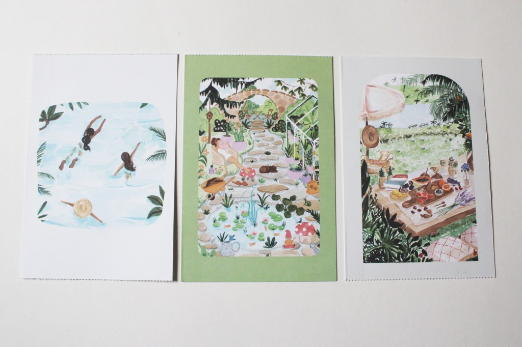 Sabina Fenn Postcard Set: Sabina Fenn is this month’s box artist and a set of three or her postcards was also included. They can be sent away to friends or framed for fun accent art. I love the summery designs!