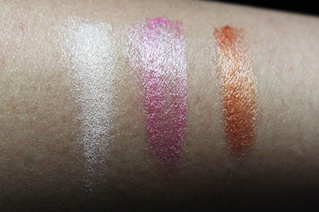 Here are swatches of the Glistening Gold, Rosey Pink, and Golden Bronze Lip and Cheek Colours. They are so beautiful! These were swatched with my fingers and just one swipe. I absolutely love blending them all of them for a stunning eye look.