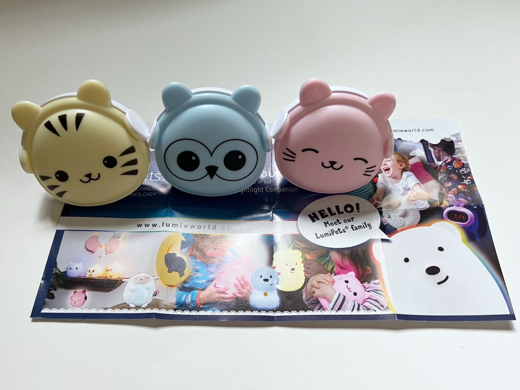The new LumiGlow Wall Nightlights are available in a three pack with a yellow tiger, blue owl and pink cat. To be honest, I thought the pink one was a bunny, but I guess it would need longer ears for that. It’s still super cute, though!