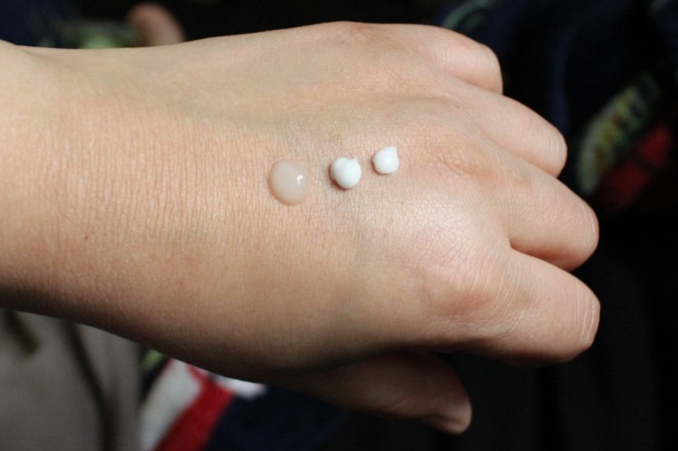 Above I have the serum, moisturizer, and eye cream “swatched.” What I love about all three products is how smooth they feel on my skin and how quickly they absorb. I have oily skin and none of them feel heavy or uncomfortable after use. I’ve been using the system for about a week and my skin feels smooth and hydrated afterwards. I especially like the hyaluronic acid and PhytoSpherix compound, as they help keep moisture in my skin.