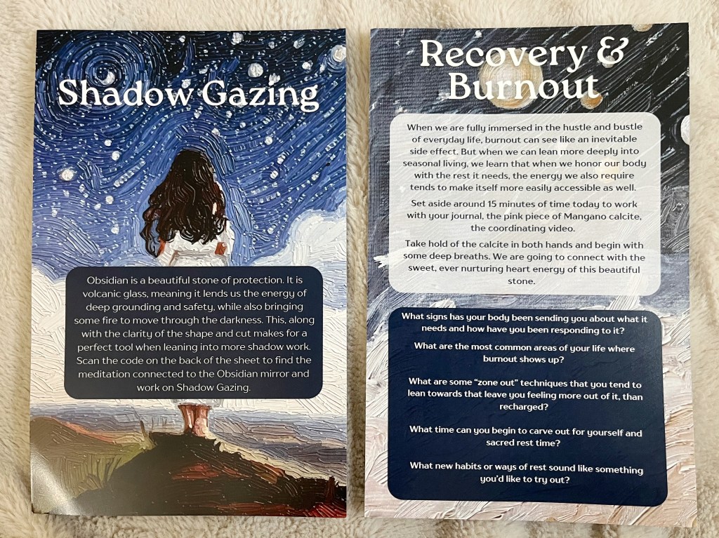 Obsidian Mirror: This was the first item envisioned for this quarter’s box. It is used in shadow work, which is working on any part of yourself that you’d rather keep in the dark (think: something embarrassing, shameful, frustrating that you feel about yourself). You can use the meditation and obsidian mirror to work through these difficult feelings to help heal and connect with yourself.