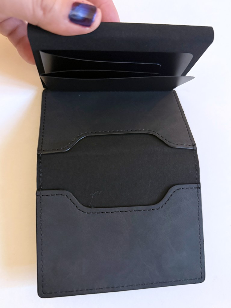 The card slot has a slide function where you press a side button down and your cards will pop out for easy access. I love this feature; it makes it so simple to have your payment card ready. I was able to comfortably fit five cards in the slot, but the website says that seven can fit in the card slot. There is also room for four more cards in the interior flap pockets.