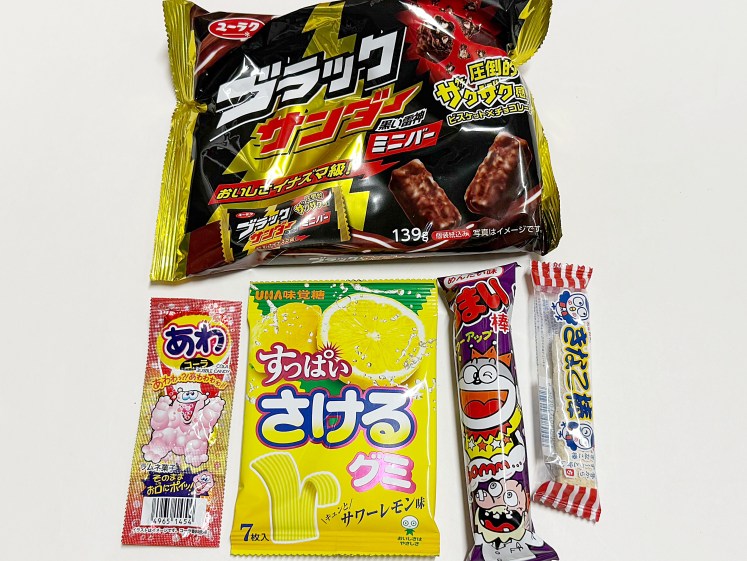 - Yuraku Black Thunder Mini Bar: This bag has a bunch of mini candy bars inside that are chocolate-covered crunchy cocoa cookie biscuits. They reminded me of the crunchy cookie part of an ice cream cake!