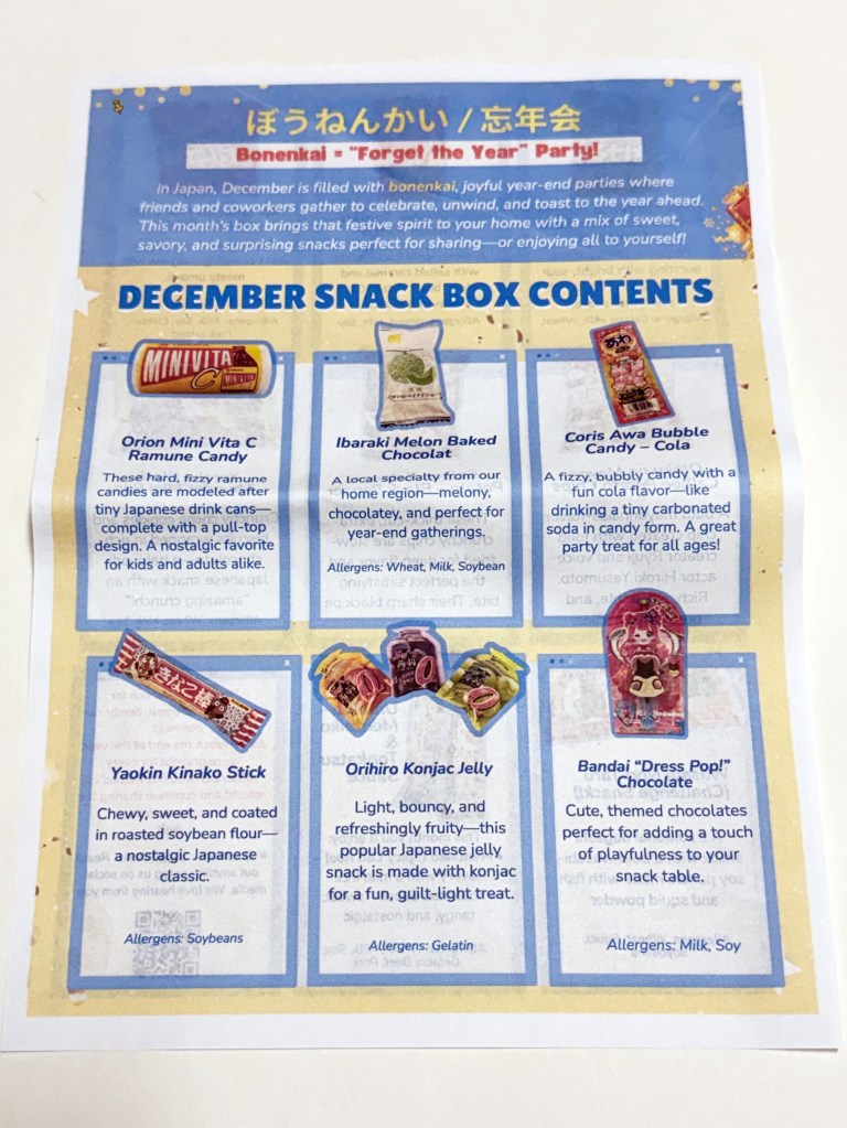 The December 2025 box was themed around “bonenkai,” or “Forget the Year” parties that celebrate the year’s end. Friends and coworkers gather to celebrate and toast the upcoming new year. There were 15 snacks total, with a good variety represented.